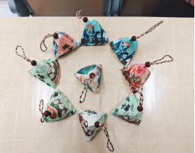 (志愿者们观看教程学做香囊) (香囊成品展示)
