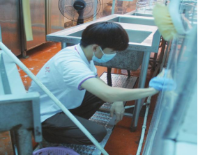 (志愿者清洁厨房墙面) (志愿者们清扫后院)