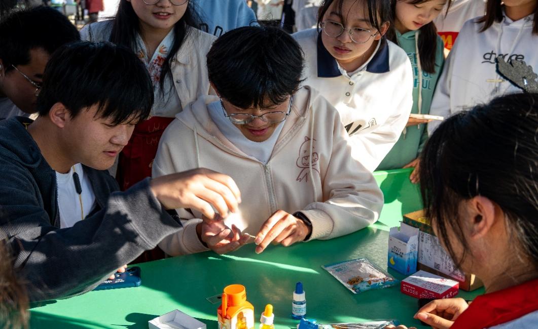 “型”字站点:春风号角起,检验战旗扬,为了提高同学们的专业素养,此站点各小组内需指定一名检测者和被检测者,并在工作人员的指导下顺利检测出血型,小小的采血针便展现出无穷的力量,推动各位同学对学术的不断追求。