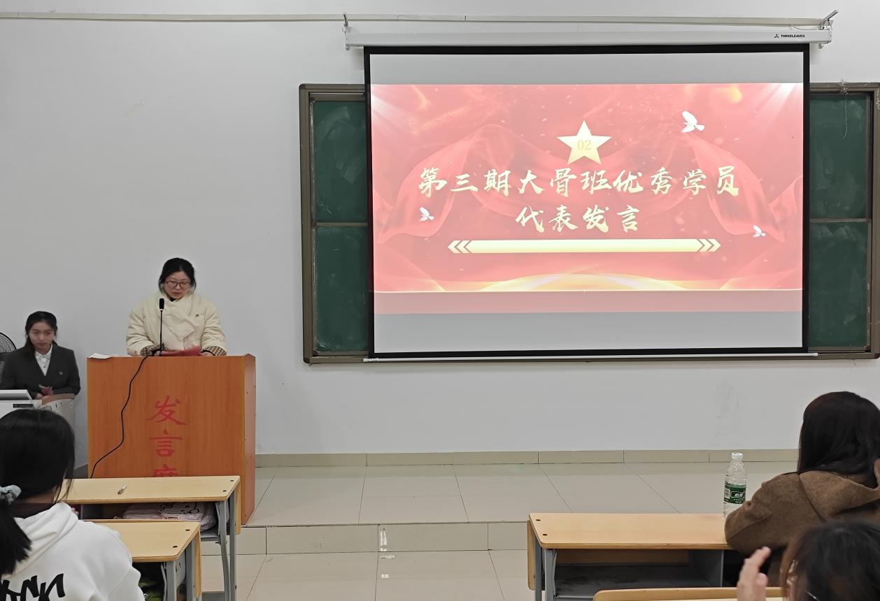 第三期大骨班优秀成员祝丹结合自身成长经历作分享发言。她从理论学习、社会实践、团队写作等方面总结了大骨班的收获,并号召新一期学员在培训中端正学习态度,强化责任意识,以青春之名书写担当,以奋斗之我践行信仰。