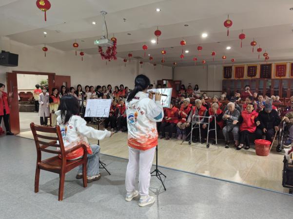 为了让老人们感受到更多的欢乐与活力,志愿者们还精心准备了一场精彩的文艺表演。他们协助敬老院工作人员为到场老人提供座位,随后由志愿者表演二胡、笛子和简单舞蹈。悠扬的二胡声、清脆的笛子声在敬老院内回荡,为老人们带来了一场听觉盛宴。在表演简单舞蹈过程中,志愿者邀请老人上台一起动起来。老人们在志愿者的带动下,纷纷起身参与,活动现场充满了欢声笑语,气氛热烈而温馨。表演结束后,志愿者们为老人发放礼品,让老人们感受到满满的关爱与祝福。