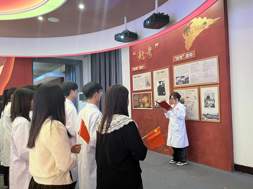 在革命烈士纪念堂,全体师生庄严肃立,静默致哀,并怀着崇敬的心情敬献鲜花,深情凭吊烈士英魂,深切缅怀革命先烈的丰功伟绩。青年学子举起右手,集体重温入党和入团誓词,大骨班学员代表吴梦慧现场讲述方志敏事迹,带领全体员工诵读方志敏烈士文章。在铿锵有力的誓词和一声声洪亮的诵读声中,那段战火纷飞的光荣岁月仿佛历历在目,激发了在场师生的红色磅礴力量。